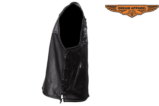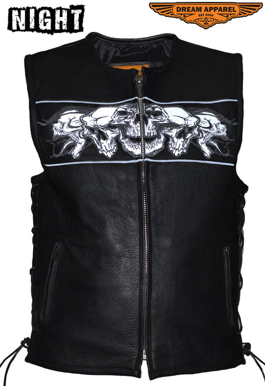 Mens Leather Vest With Reflective Skulls & Conceal Carry Pockets