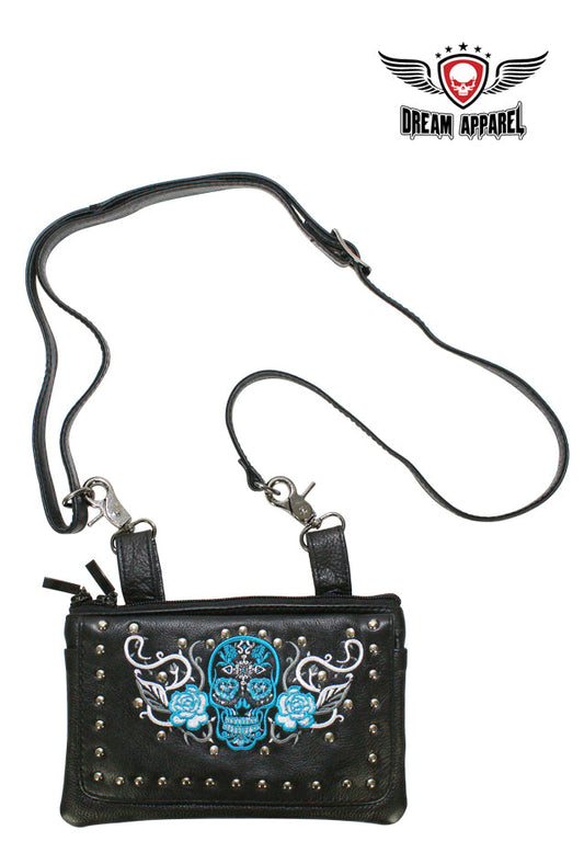Studded Turquoise & White Sugar Skull Naked Cowhide Leather Belt Bag W/ Gun Pocket