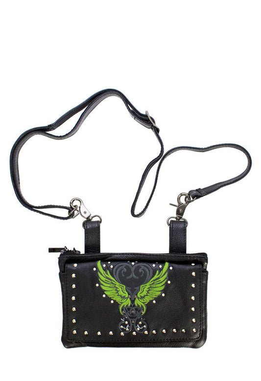 Studded Naked Cowhide Leather Belt Bag with Lime Green Wings