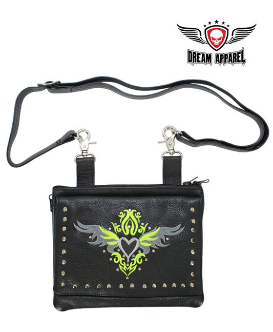 Studded Naked Cowhide Leather Lime Green Winged Skull Belt Bag