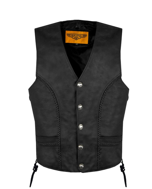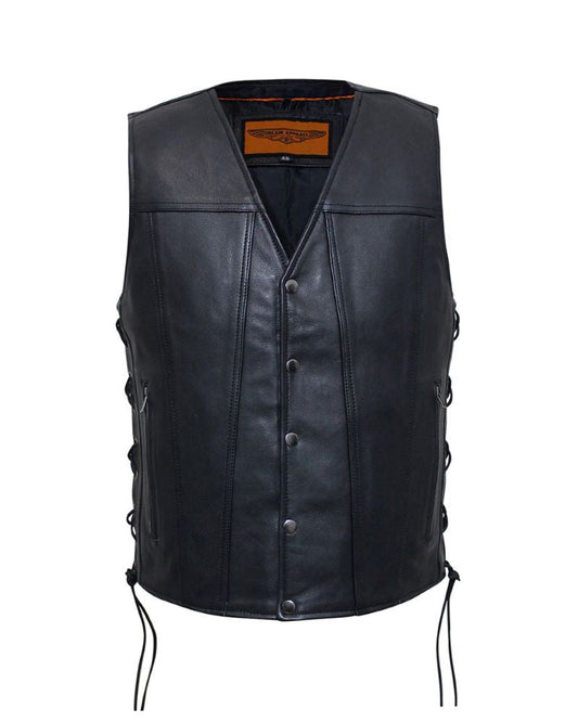 Mens Motorcycle Club Leather Vest With Fold Collar & Hidden Snaps