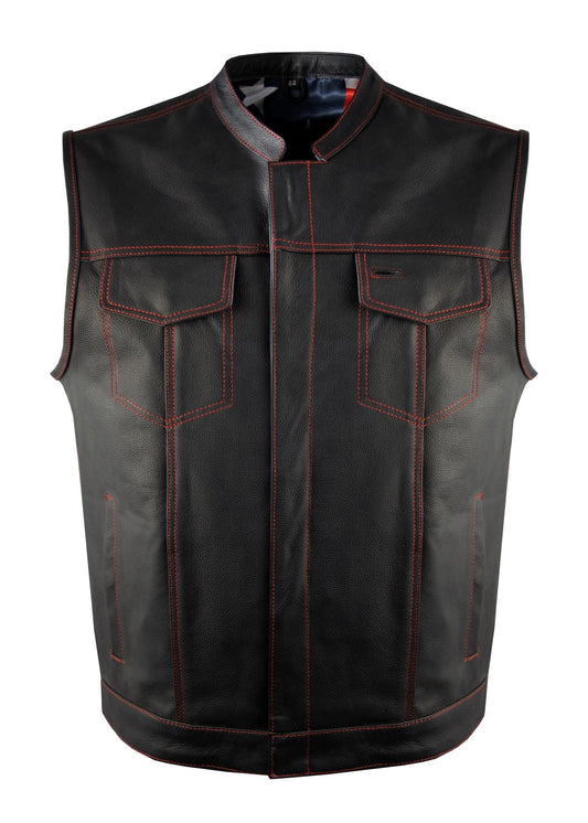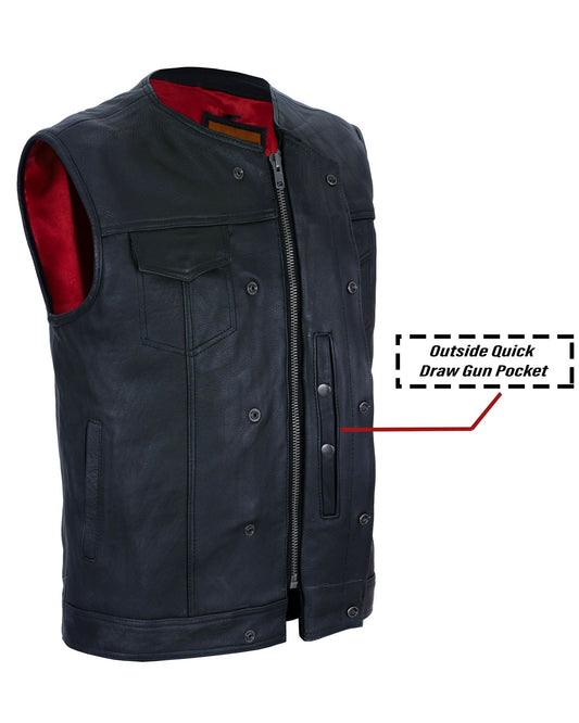 Mens Zippered No Collar Leather Motorcycle Club Vest with Red Liner Quick Draw Conceal Pockets