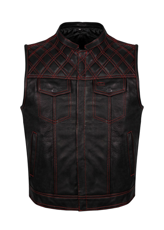 Mens Premium Naked Leather Motorcycle Club Vest Red Thread Zipper Front, Diamond Padding