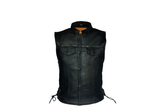 Mens Leather Motorcycle Club Vest With Zipper & No Collar