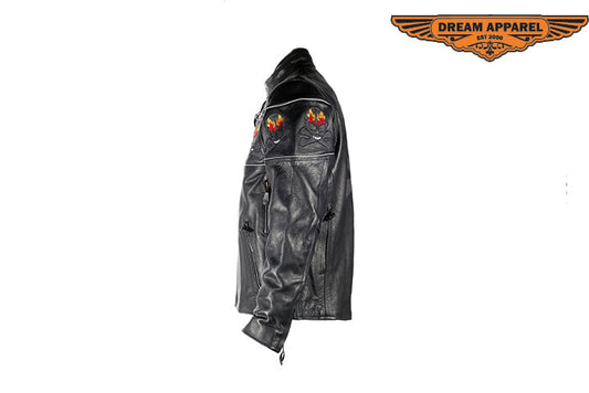 Mens Black Racer Leather Motorcycle Jacket With Flaming Reflective Skulls