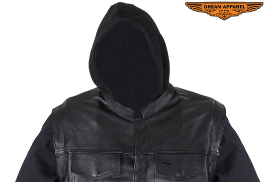 Black Leather Jacket with Removable Canvas Sleeves & Hoodie