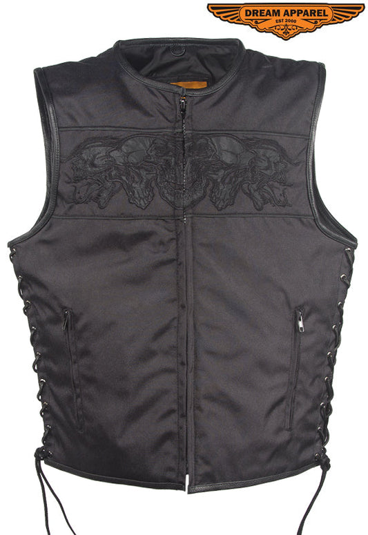 Mens Black Textile Motorcycle Vest With Reflective Skulls Across Chest & Back