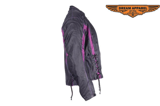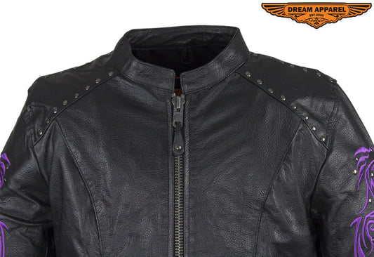 Women's Studed Motorcycle Textile Jacket With Purple Hoodie & Sull & Wings