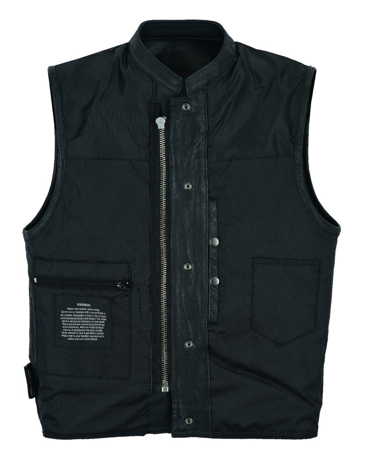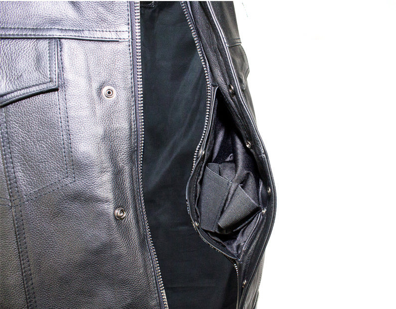 Dream Apparel® understands the value of freedom, comfort, and personal protection. That's why we've made this genuine naked cowhide leather vest, but now with even easier access to your gun. Right between the first set of snaps and the zipper, there is a snapped gun pocket making the retrieval of your gun quicker and less complicated. Along with thats is another deep concealed gun pocket inside with button snaps, an inside slip pocket, and an inside zippered pocket. You're going to love the fit and feel of a premium cowhide leather club vest with a racing style collar, soft leather trim around the neck and arms, and a zippered front closure with button snaps. Make it truly your own by sewing any patches or embroidery onto the one-piece back panel. The two roomy slip pockets on the waist and two breast pockets with button-down flaps give you all the room you need for a days ride and will have you ready for whatever adventures await.