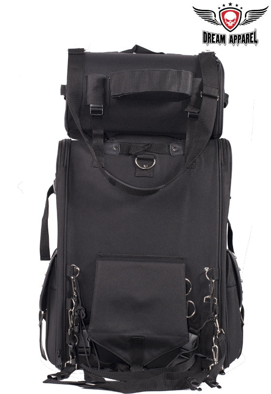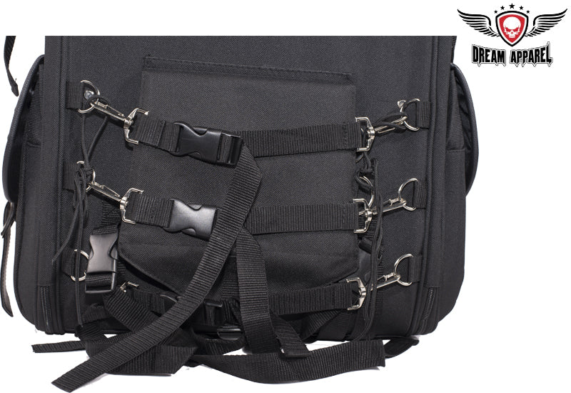- Detachable top compartment with heavy duty Velcro strap that can also secure to sissy bar