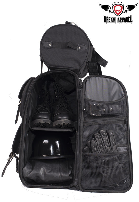 - Detachable top compartment with heavy duty Velcro strap that can also secure to sissy bar