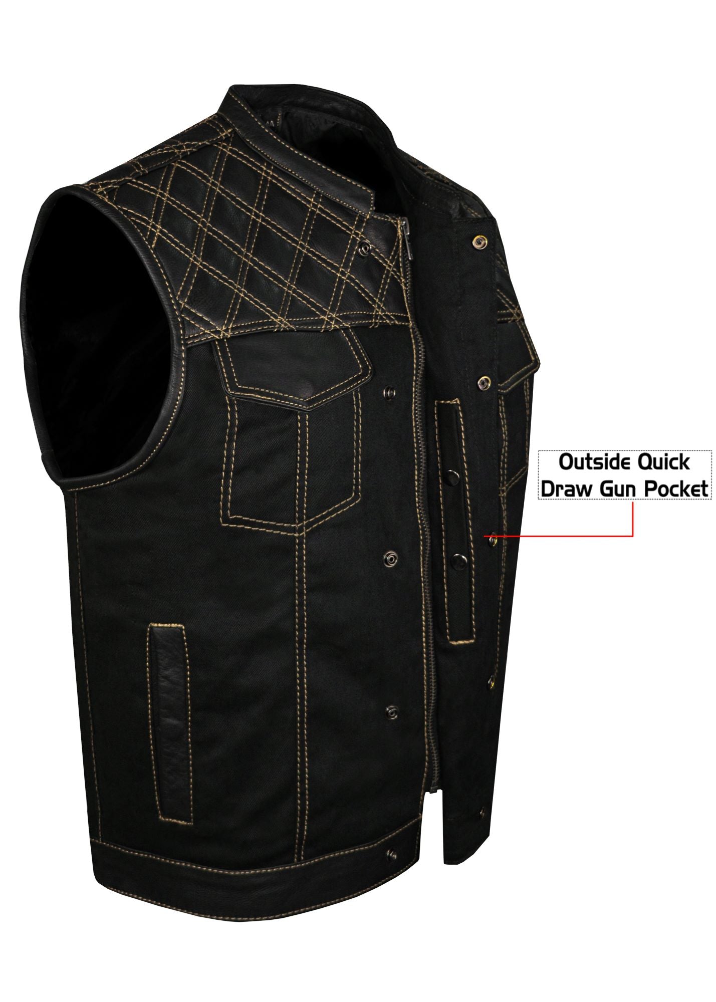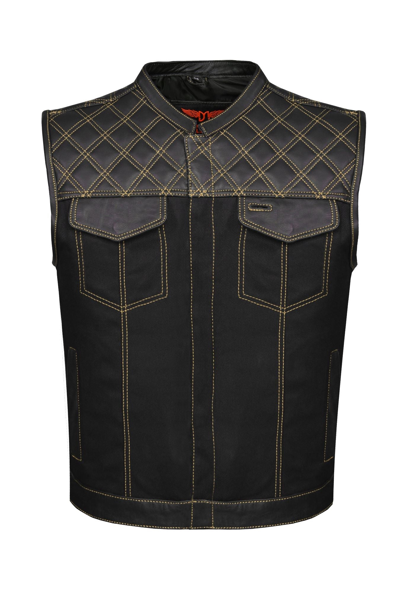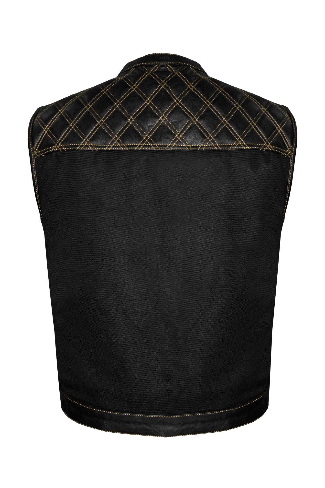 Dream Apparel Mens Black Club Vest Diamond Design Gold Thread Leather & Denim, Diamond Padding