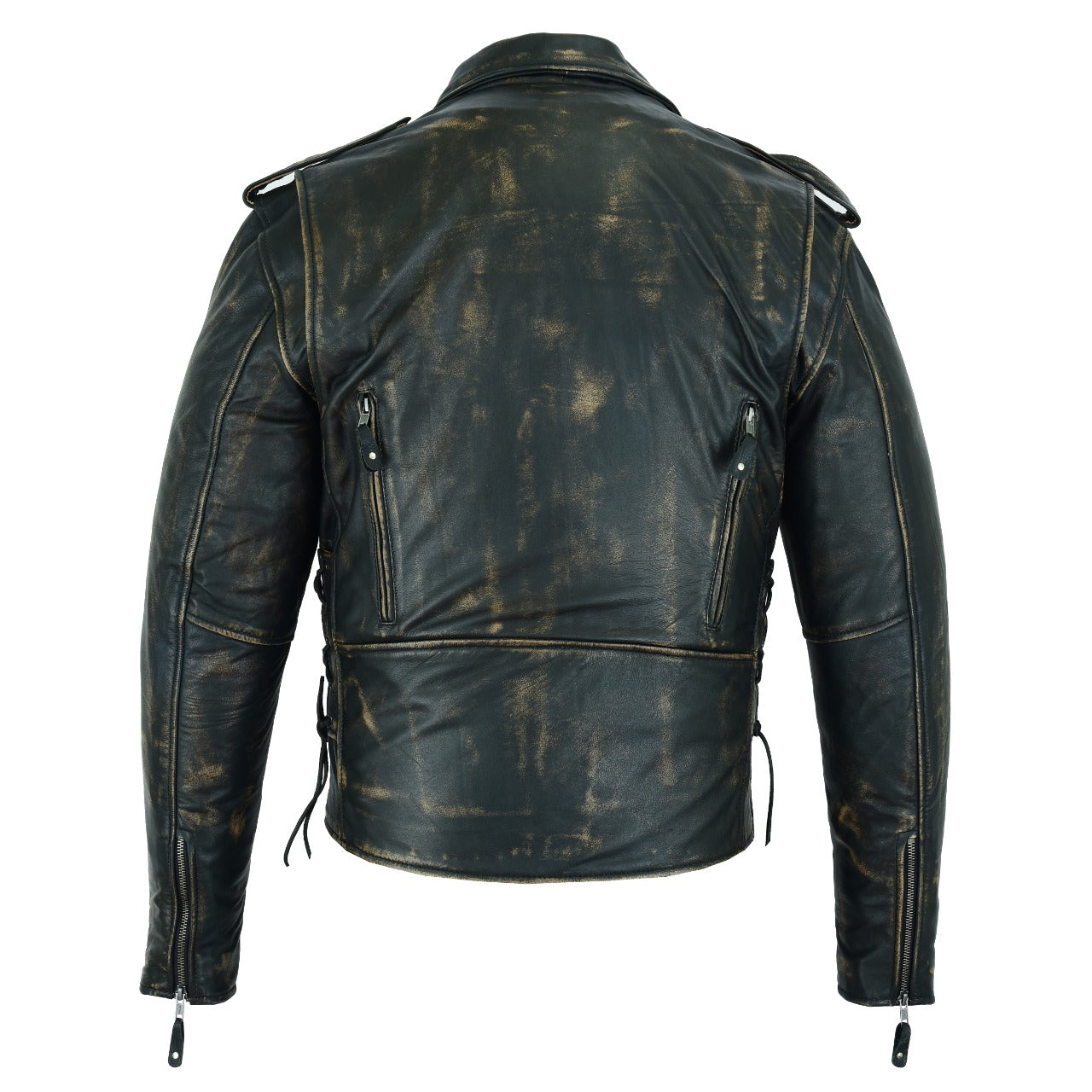 Bring back the good ol' days in our brown genuine, heavy-duty, soft leather jacket with the terrific vintage look. Our fashionable jacket features a full, zip-out lining that runs through the sleeves, epaulets on the shoulders, a fold-down notched lapel collar with button snaps, side laces, and a front zip-up closure. Your comfort's guaranteed with a leather belt, zippered cuffs, two zippered air vents on the back, and one on the front. Bring everything for your trip in two roomy zippered waist pockets, two large concealed gun pockets, and a button-snap stash pocket. You're going to love the fit and feel of this amazing jacket by Dream Apparel.
