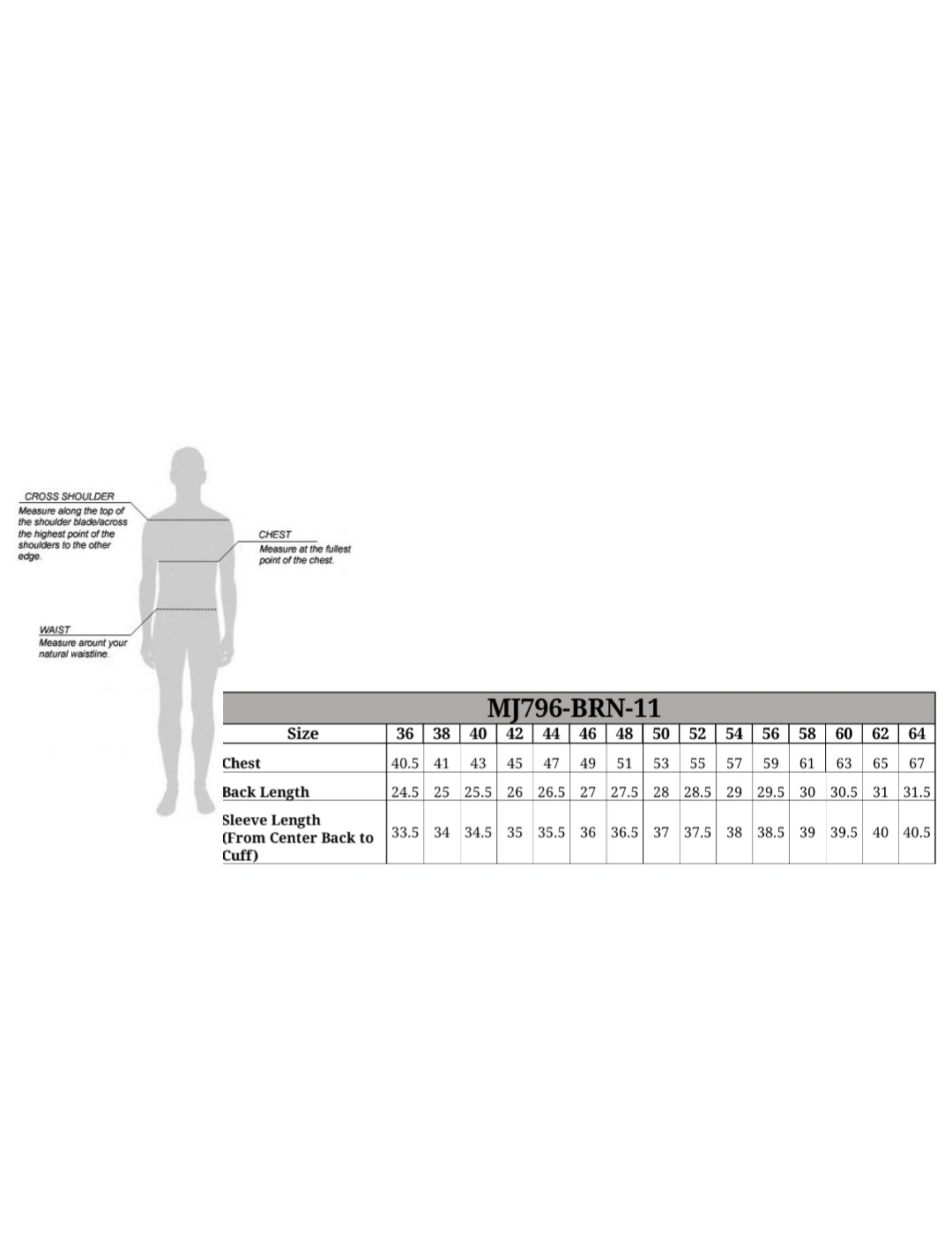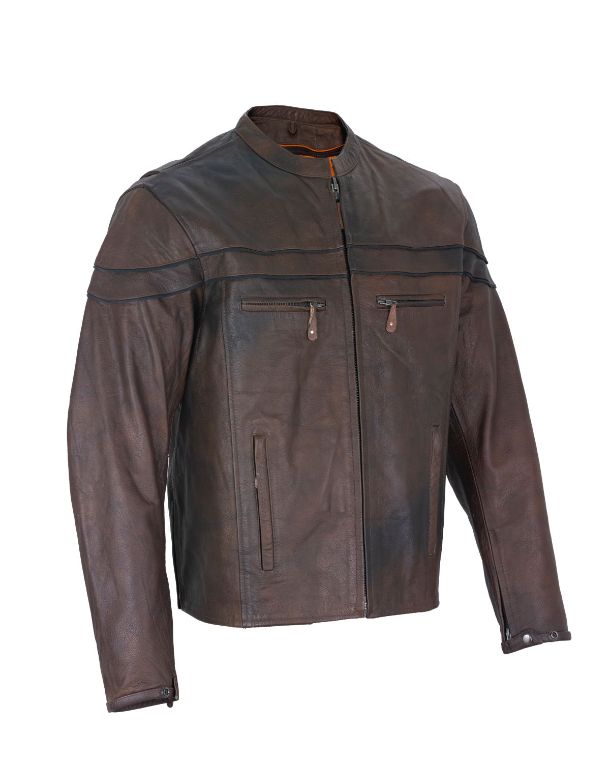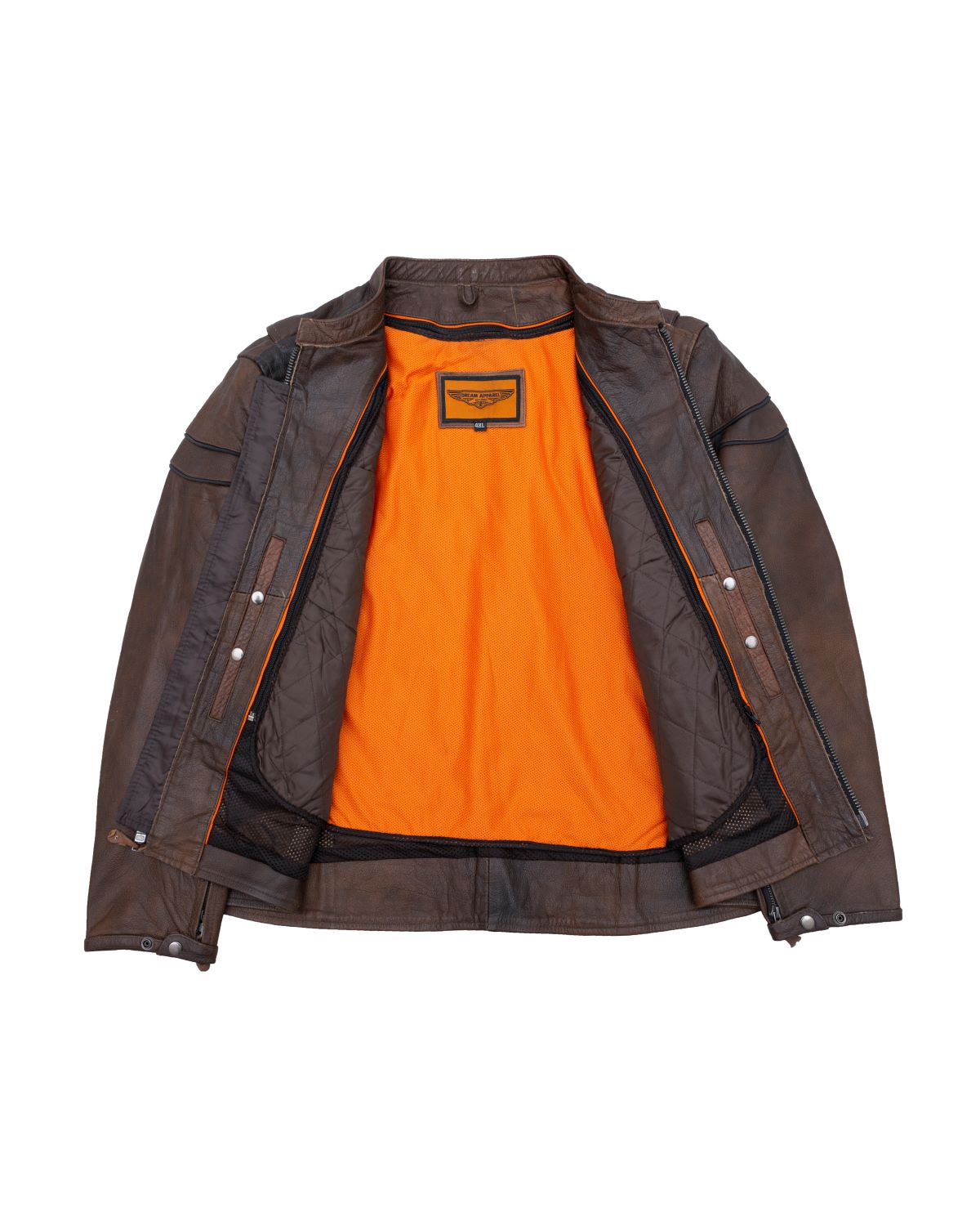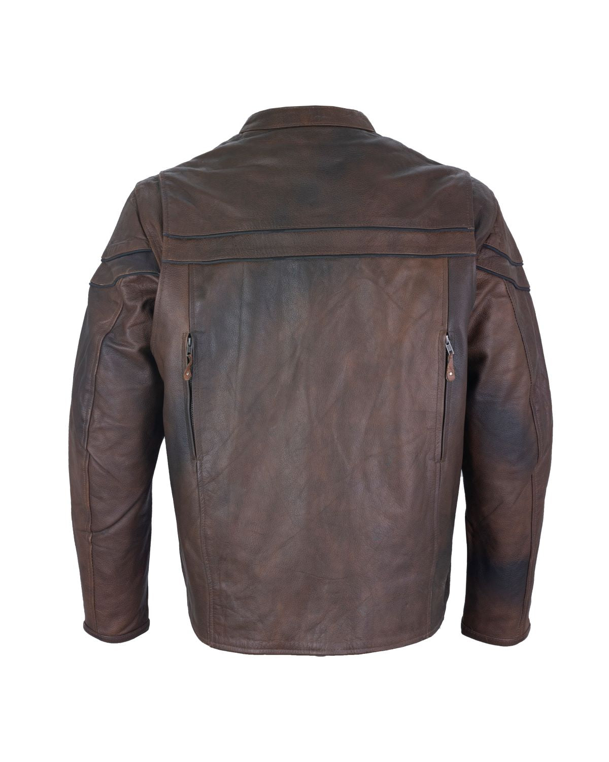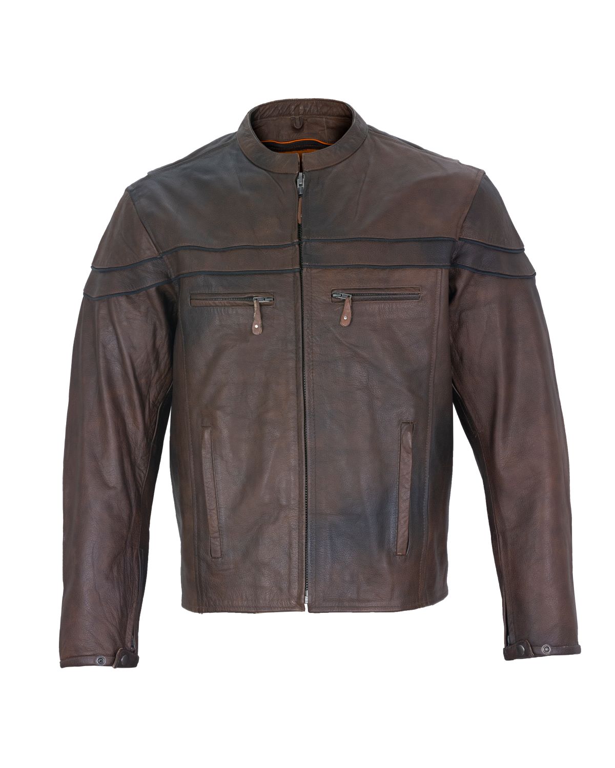 Our dark brown naked cowhide leather jacket features two large concealed carry pockets inside with double button-snaps, and reflective double piping that runs across the front, shoulders, and back to keep you protected inside and out. Two large zippered pockets on the waist allow you to carry everything else you might need for a quick run or long cruise. Your pleasure's assured thanks to the full range of comfort features like a racing style collar, a zippered front closure, adjustable zippered sides, zippered cuffs with button snaps, a zippered full lining that runs through the sleeves, two zippered air-vents on the front and back, and vents and grommets under each arm. This incredible jacket makes an amazing value, be sure to place your order before they're all gone.