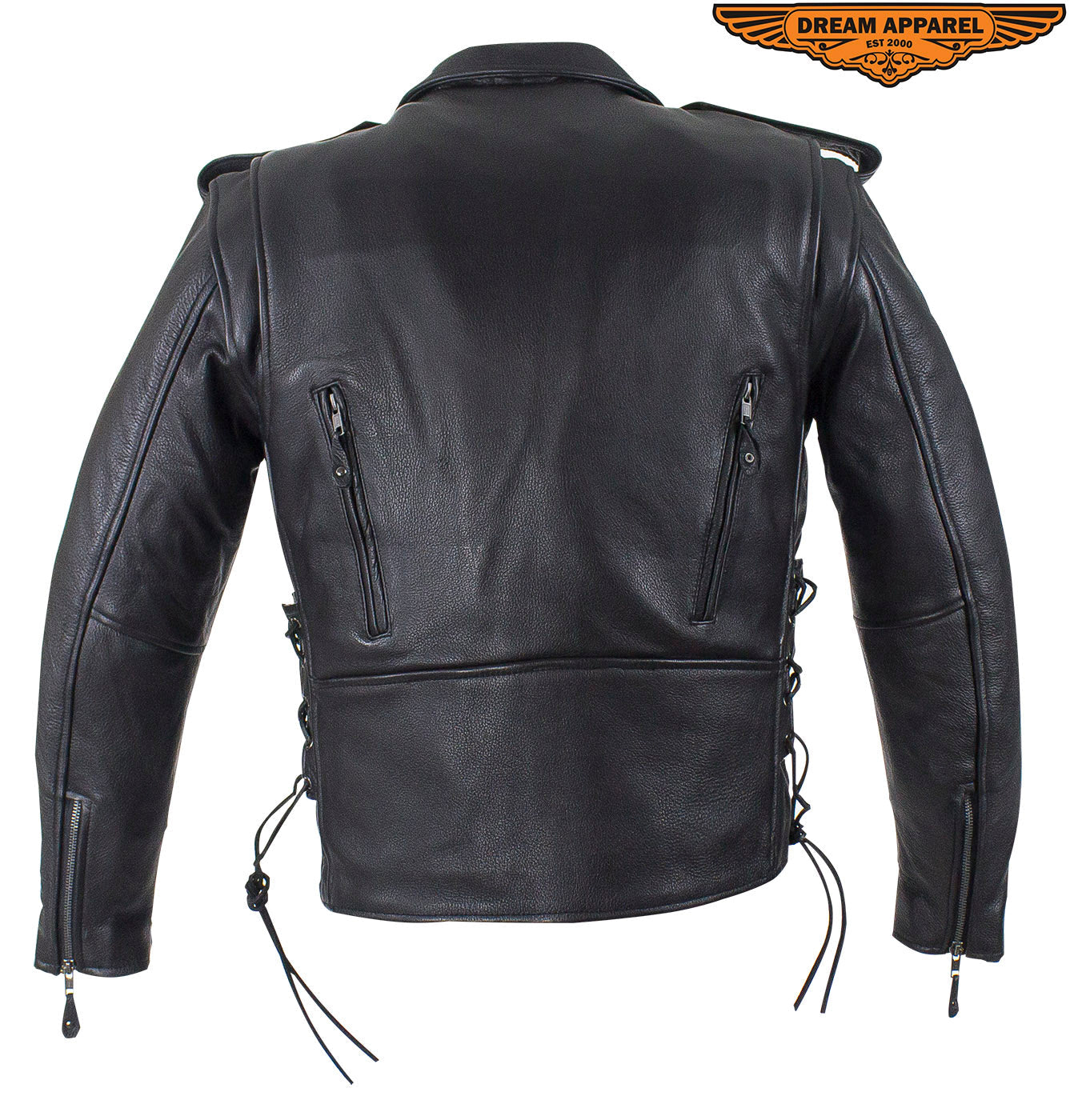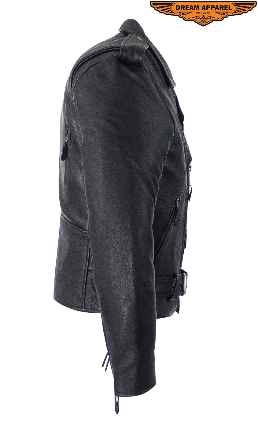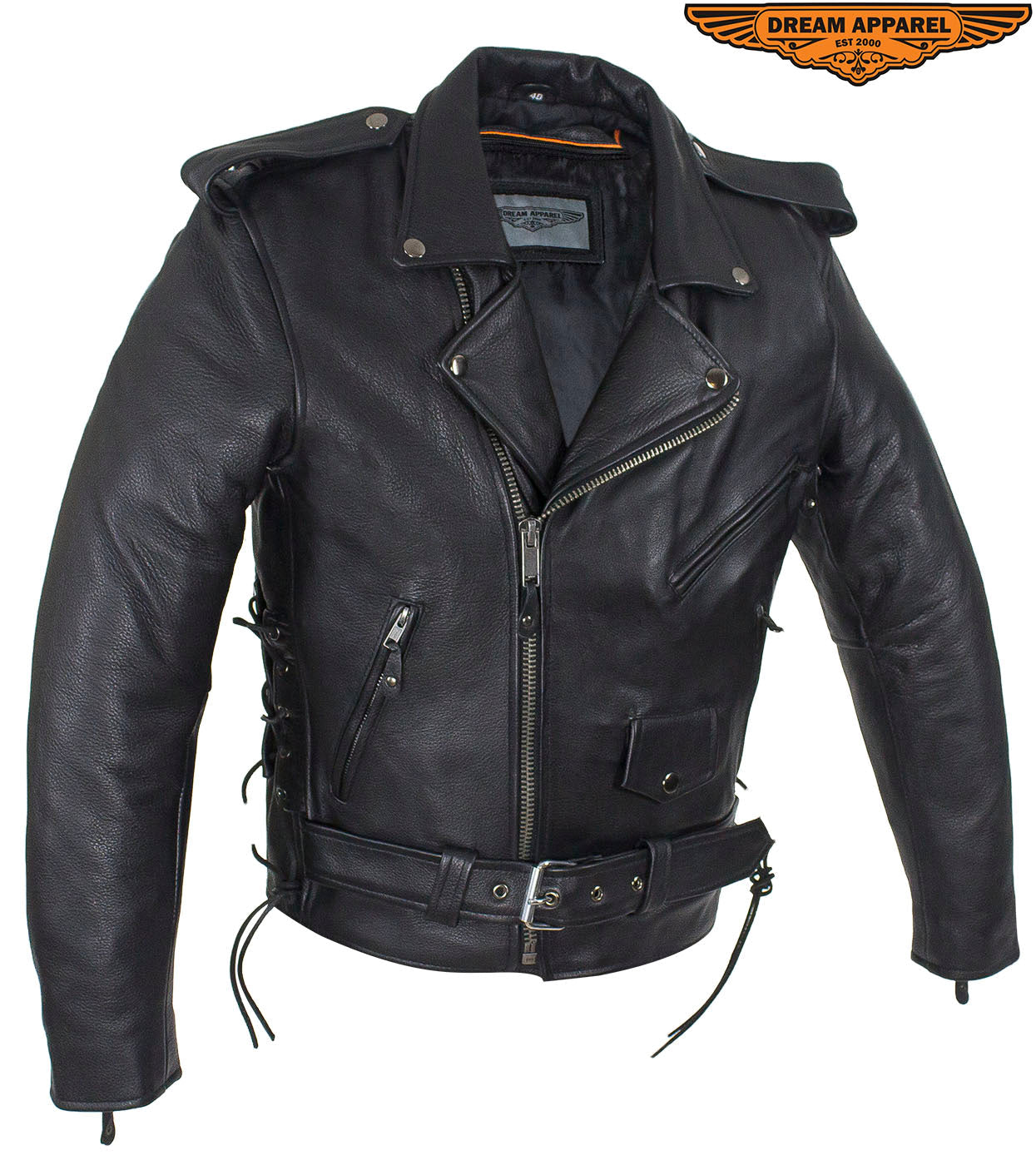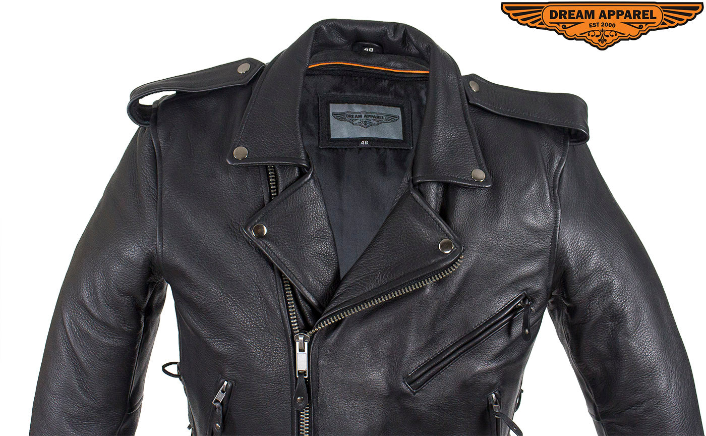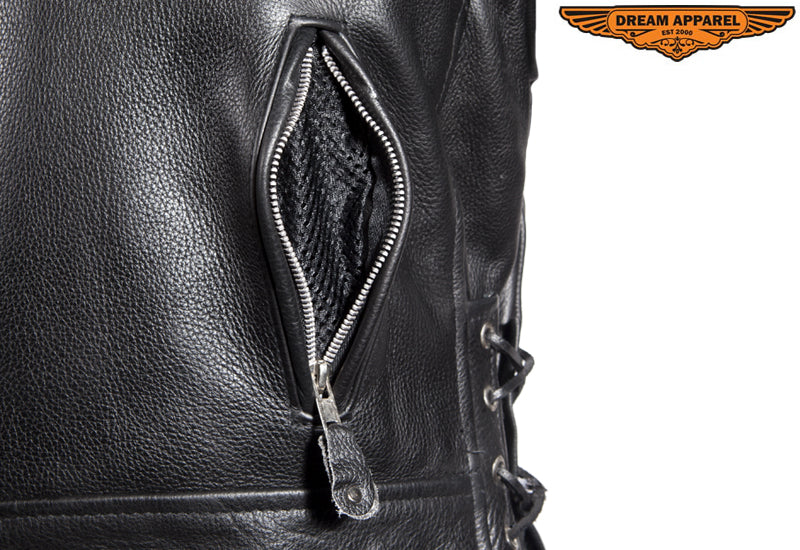 Mens Classic Police Style Motorcycle Jacket With Side Laces, Conceal Carry Gun Pockets Zipout Lining