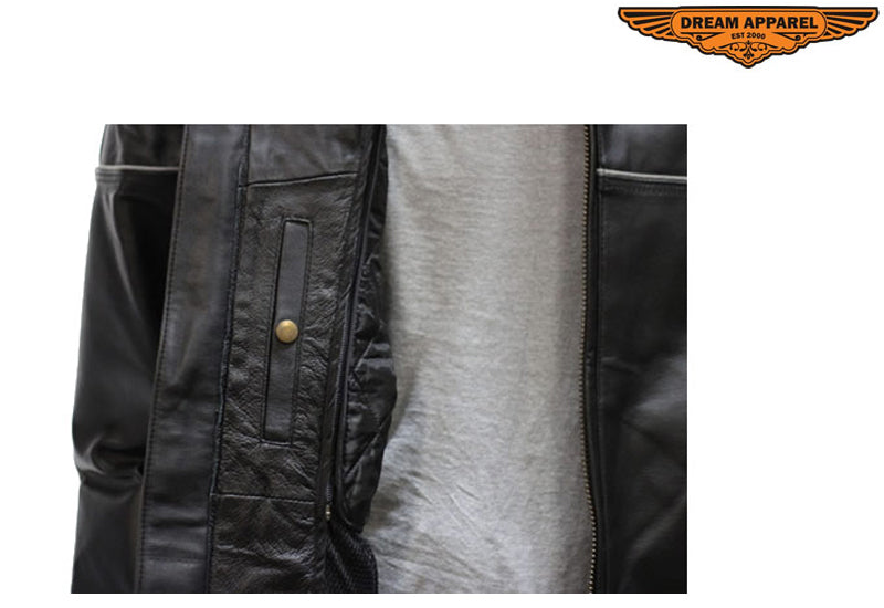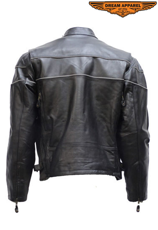 - This beautiful split cowhide leather racer style jacket is truly everything you need, from style to comfort you will not be disappointed. The reflective piping featured on the chest, shoulders and back are without a doubt an eye catching addition. Five total pockets are also included to ensure you have enough storage options. A total of 4 zippered air vents are also implemented solely to improve ventilation. The elastic gathering on the side along with the zippered cuffs were put to make for a more adjustable fit. The front zippered closure is also simple and easy to use. Do not miss out, grab yours now.