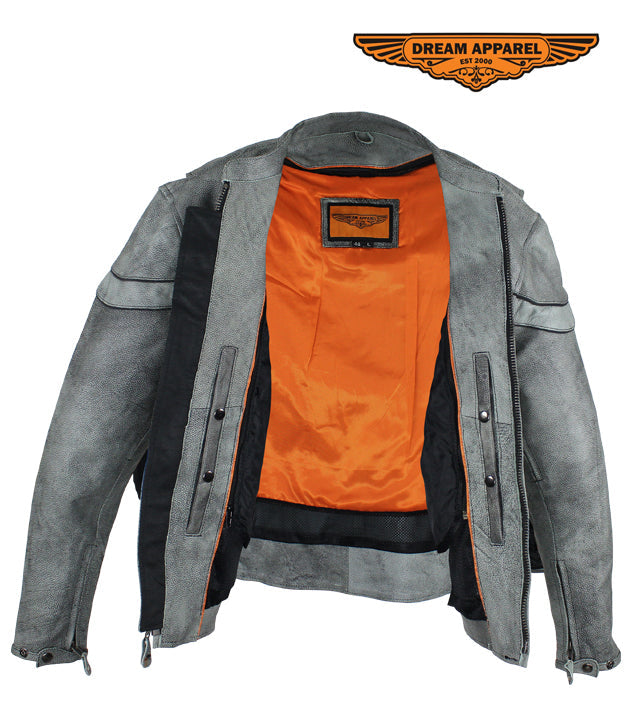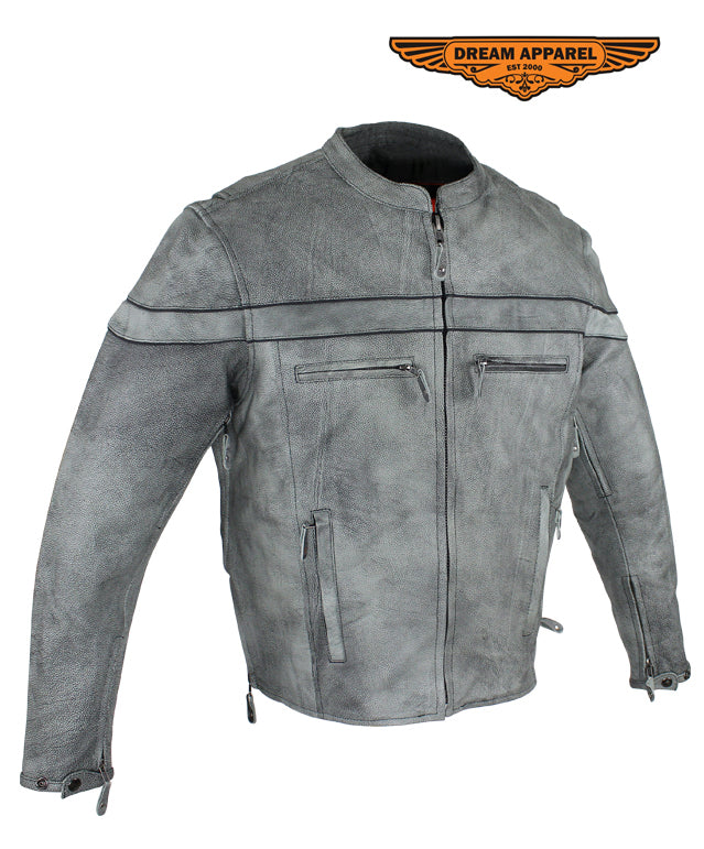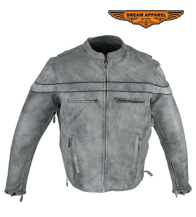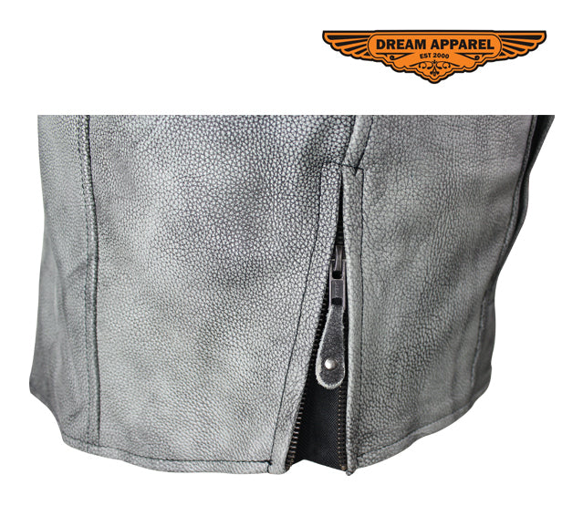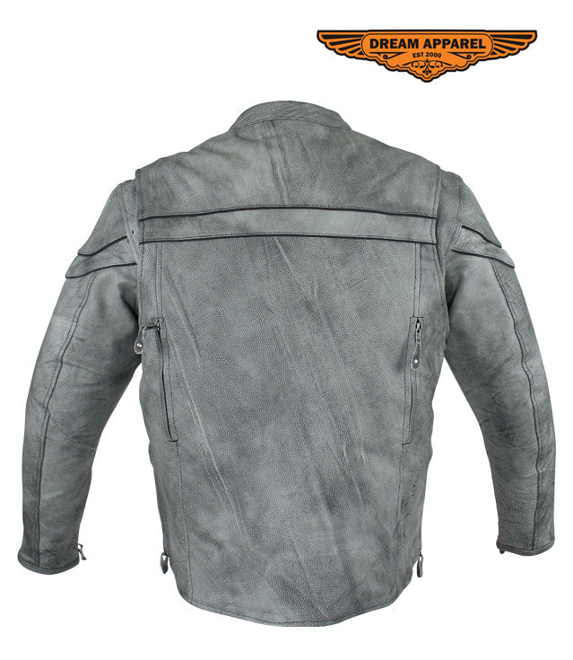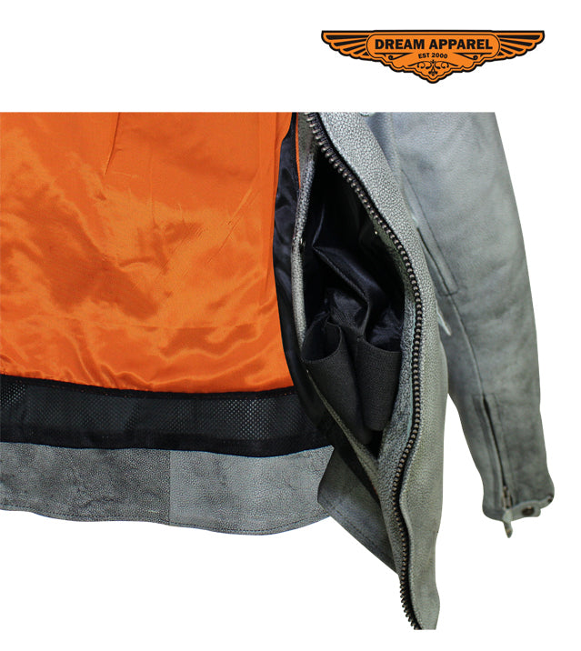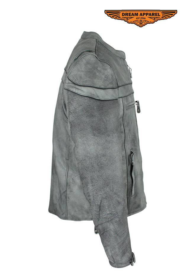 Mens Gray Naked Cowhide Leather Motorcycle Jacket With Zipper On Front