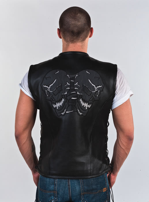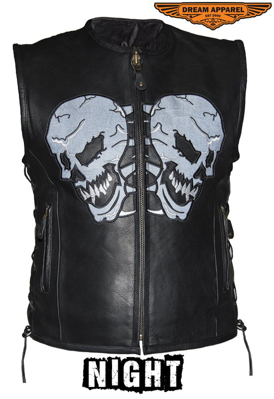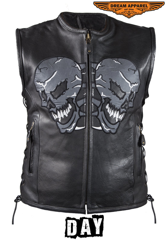 Mens Leather Vest With Reflective Evil Skulls