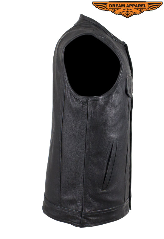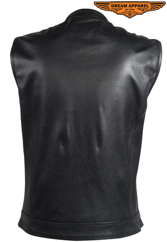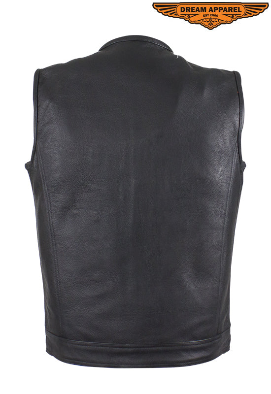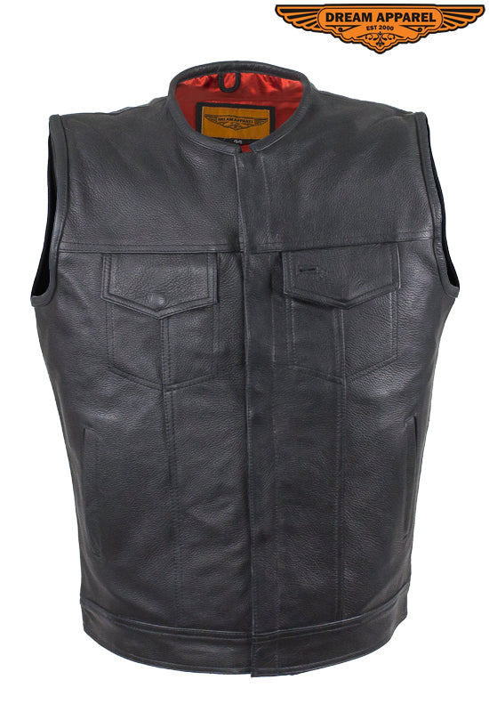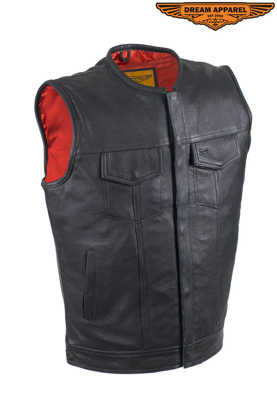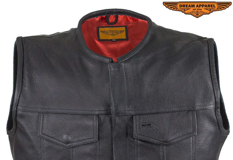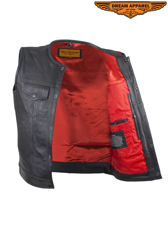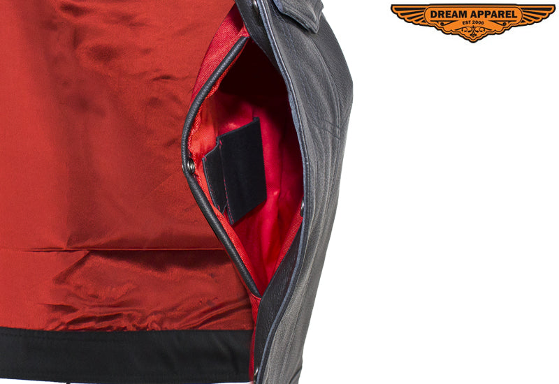 Mens No Collar Leather Motorcycle Club Vest with Red Liner