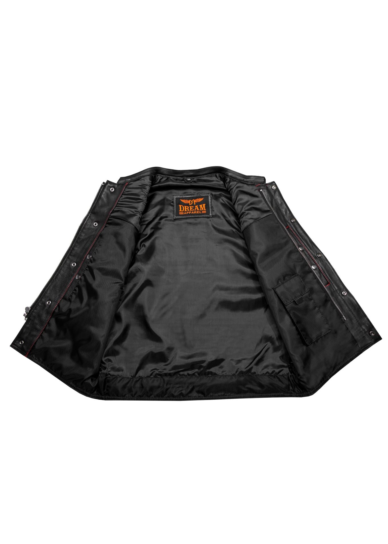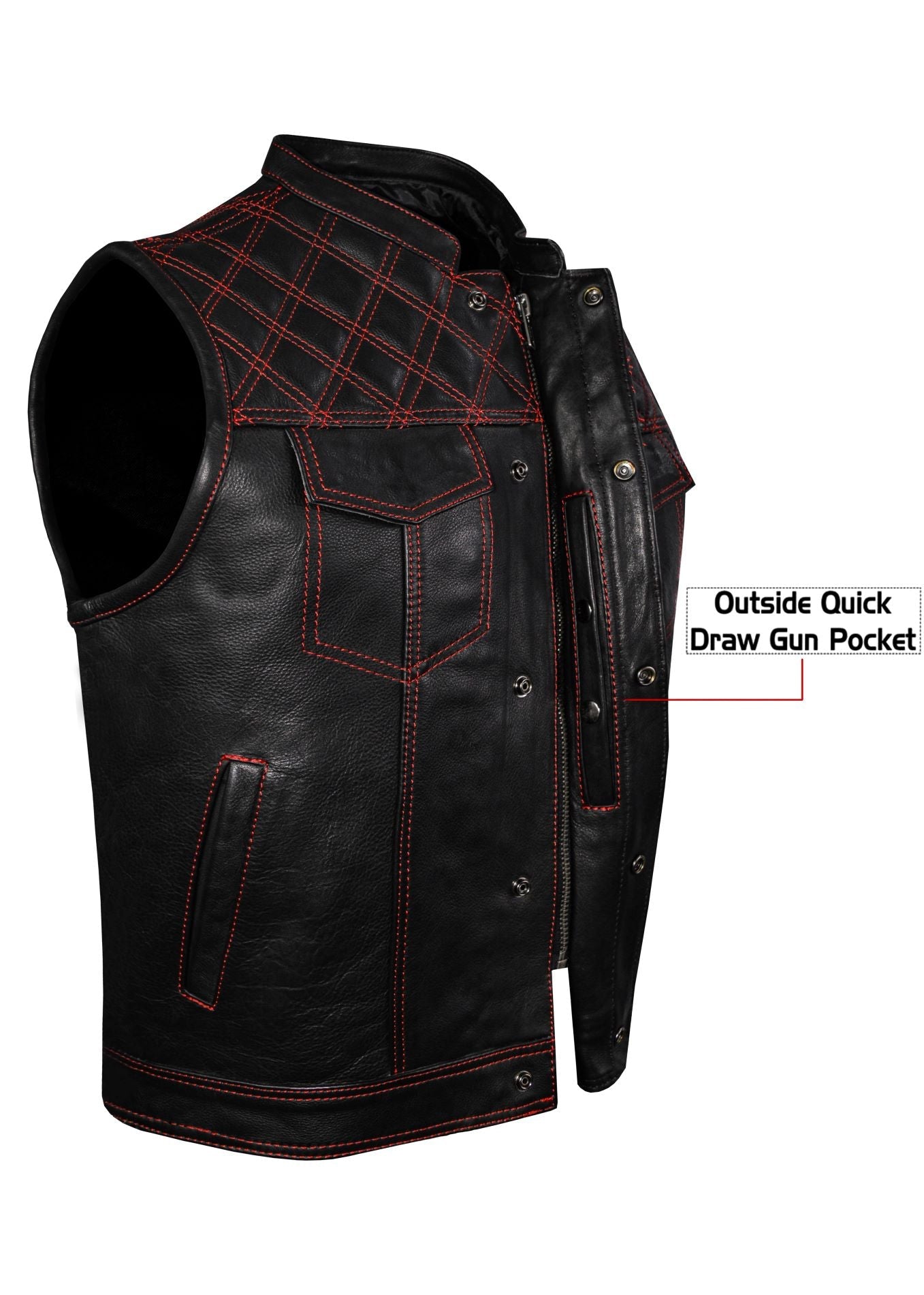 Mens Premium Naked Leather Motorcycle Club Vest Red Thread Zipper Front, Diamond Padding