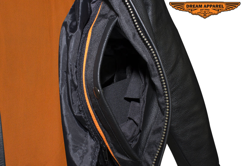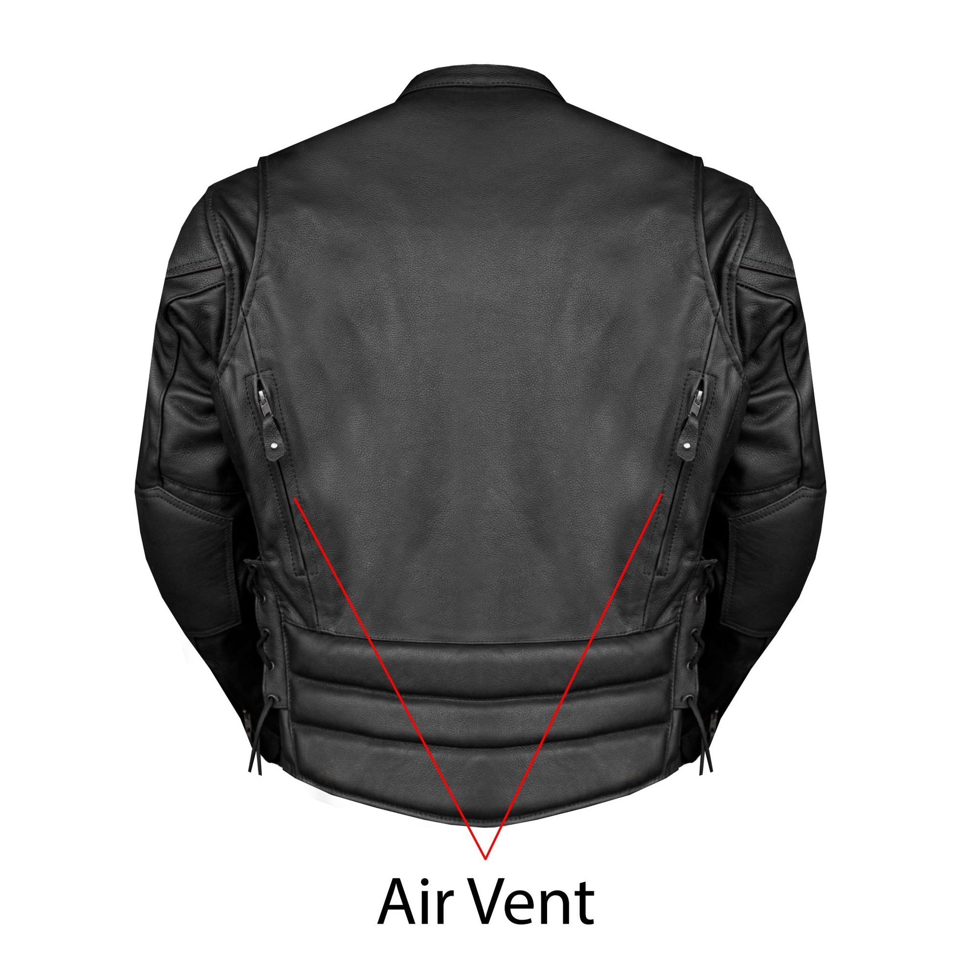 We made this Men's Racer Jacket from genuine naked, "Soft Touch" cowhide leather with your personal security in mind. You'll have plenty of protection and room for the trip with two large interior buttoned gun pockets with elastic straps and two roomy waist pockets outside with zippered closures. Other features include extra leather over the elbows, a padded bottom back piece, and full one-piece panel on the pack for all your patches. On cooler rides, you'll appreciate the warm lining that runs through the sleeves. Once it warms up, remove it to reveal a cool black mesh lining and open up the two zippered air vents on the front and two on the back. Zip yourself up and make yourself even more comfortable with the snug zippered cuffs, leather laces on the sides, and a button-snap, padded racing style collar. If you're looking for a premium leather racing jacket, then order now because supplies won't last.