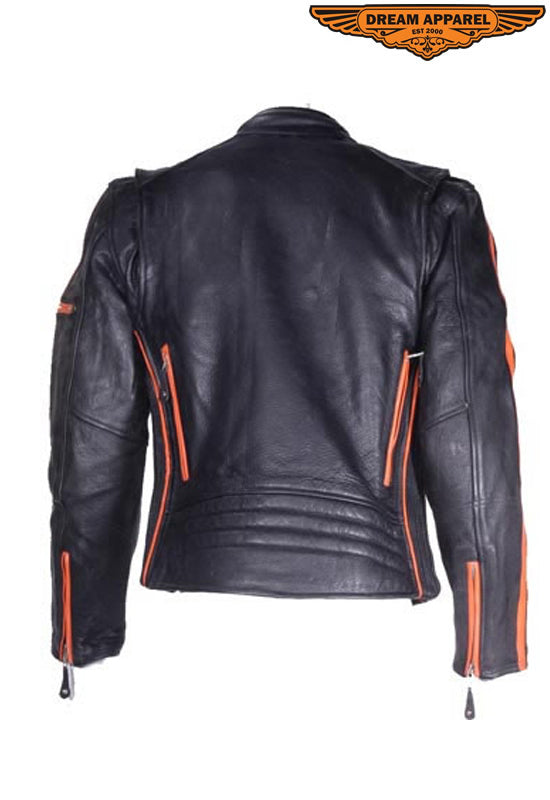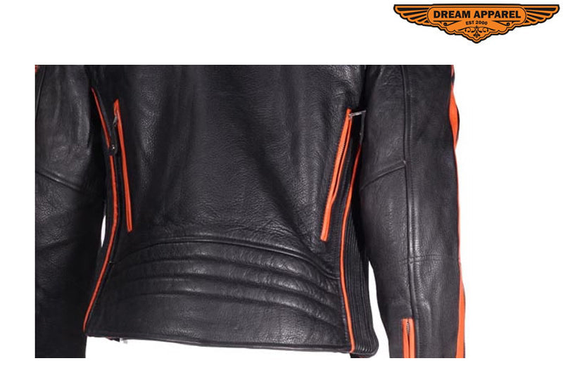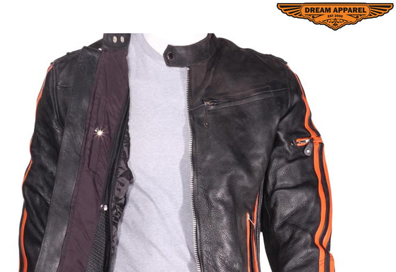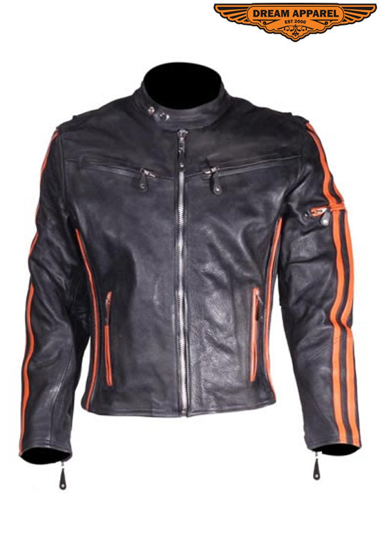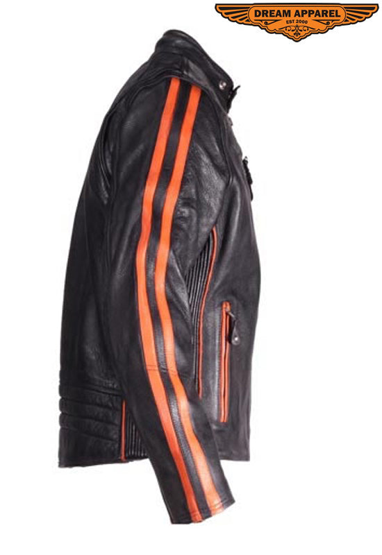 Mens Racing Leather Motorcycle Jacket With Orange Stripes