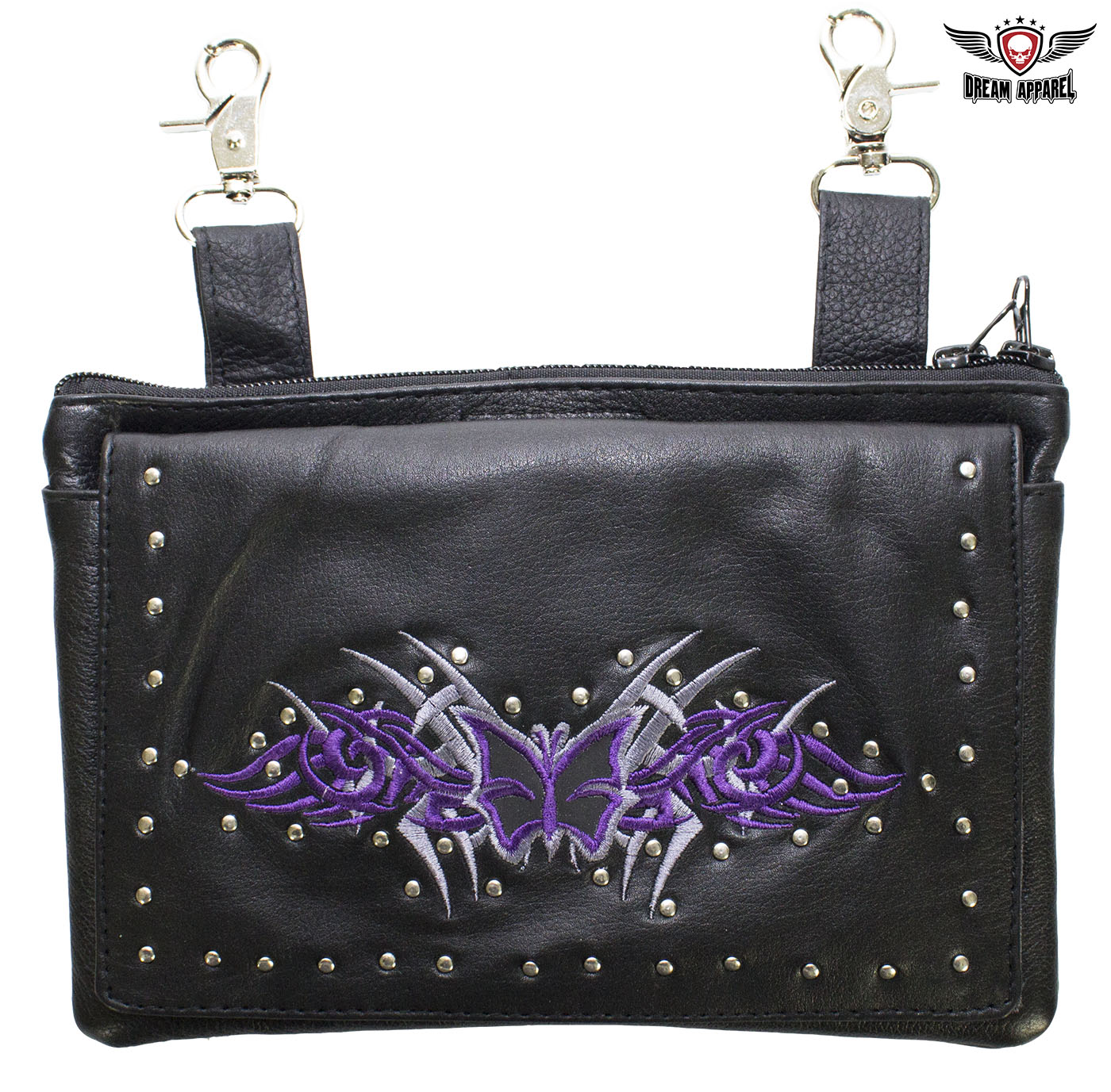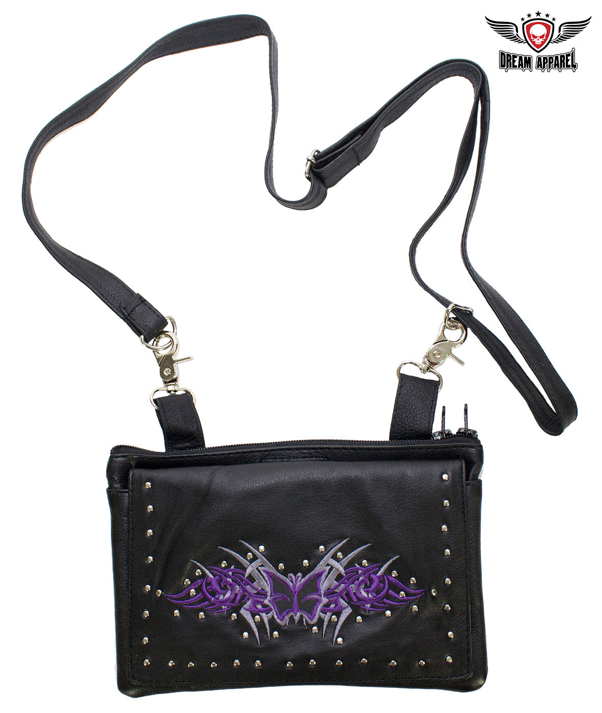 Studded Naked Cowhide Leather Gun Holster Belt Bag with Purple & Silver Butterfly