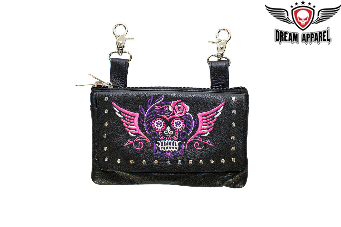 Studded Pink and Purple Sugar Skull Naked Cowhide Leather Belt Bag