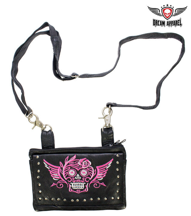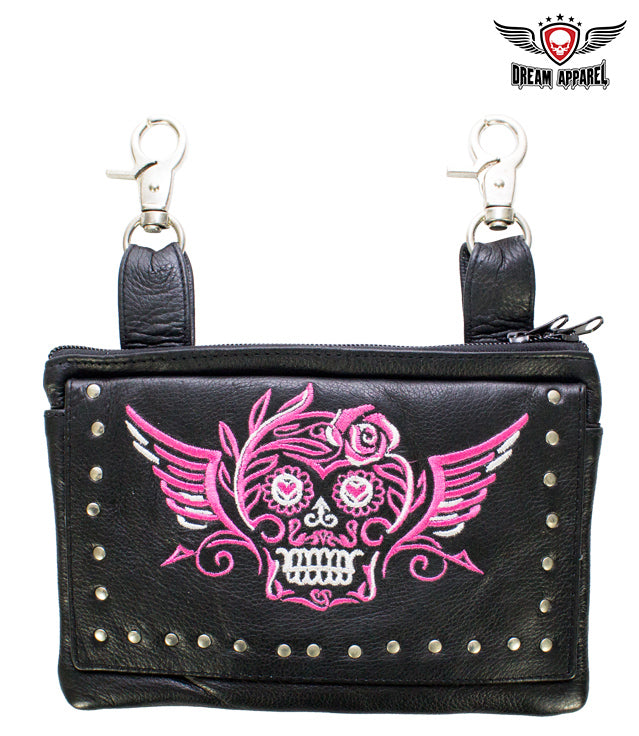 Studded Pink & White Sugar Skull Naked Cowhide Leather Belt Bag