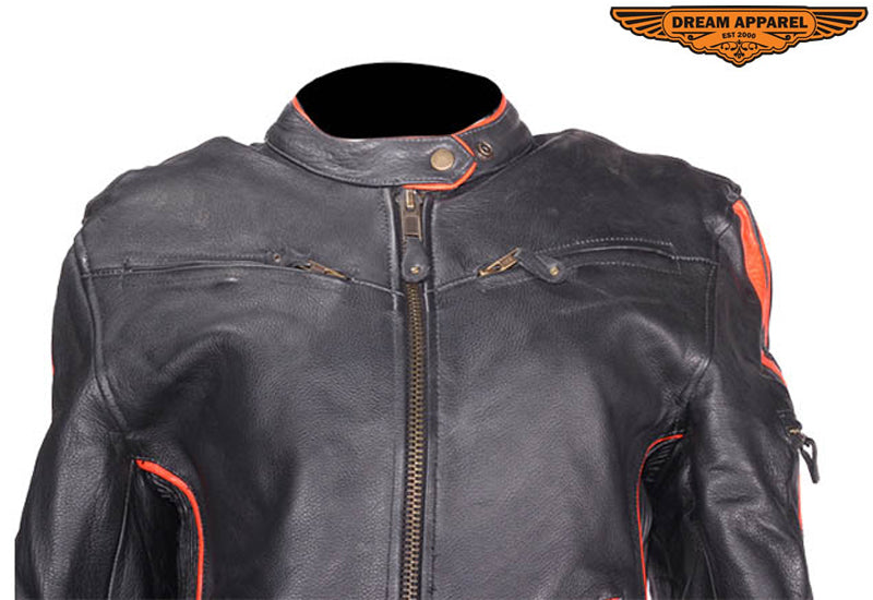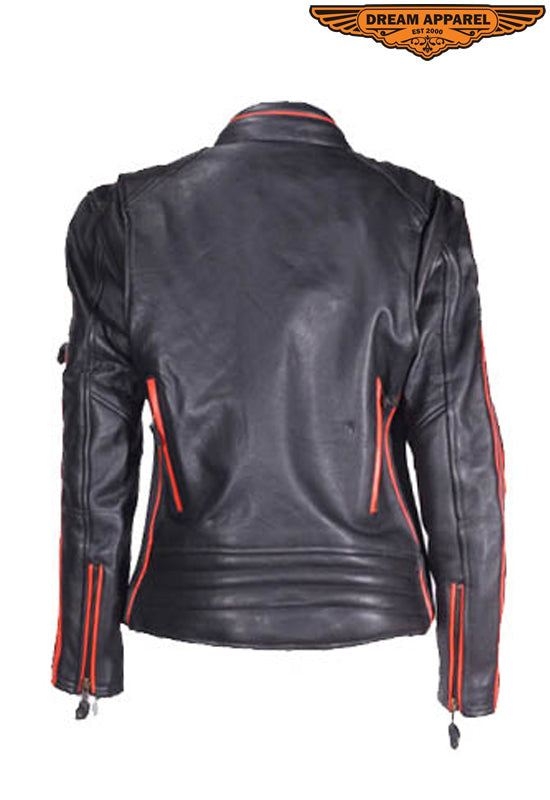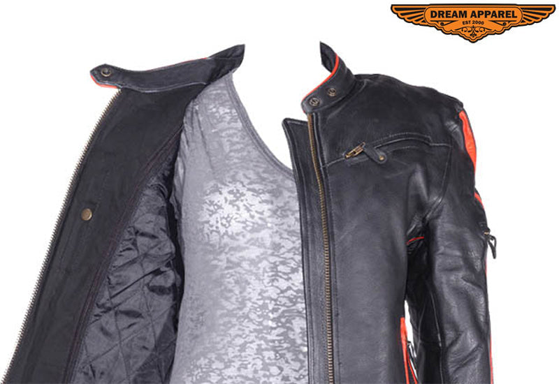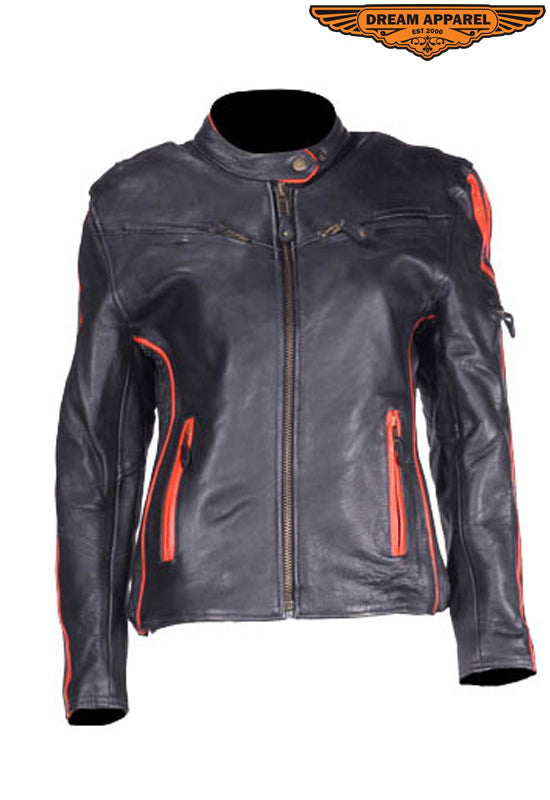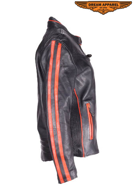 Women's Leather Racer Jacket With Double Orange Stripes Down Sleeves